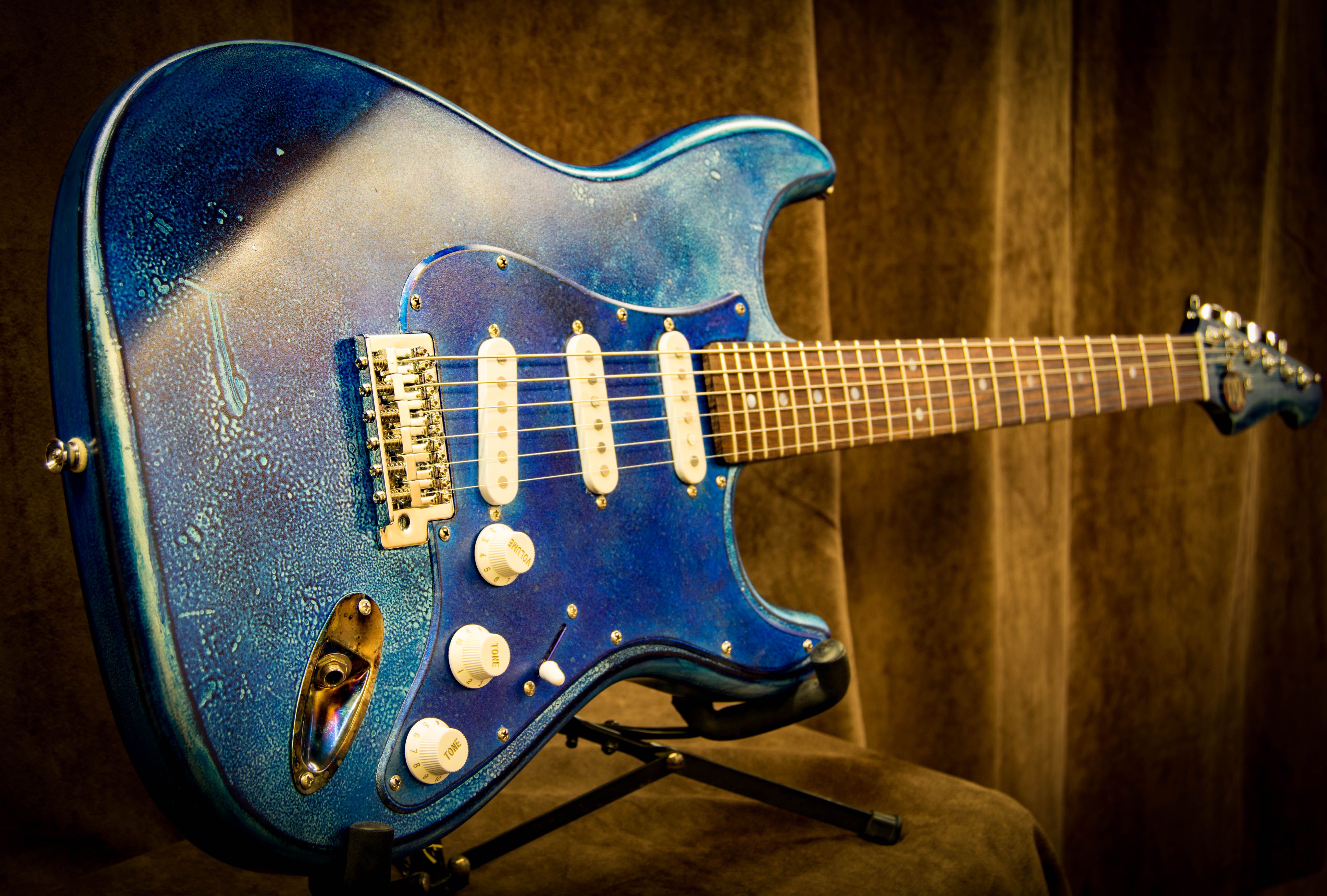A conventional DC electric guitar with an unconventional finish, plus mixed magnet pickups, and our 7-sound wiring solution...